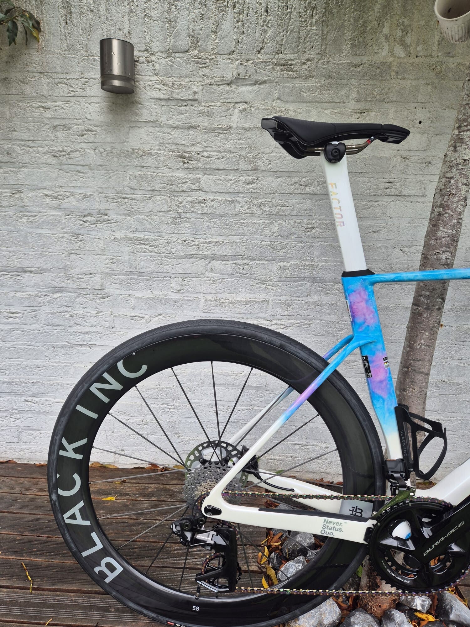 De Factor Ostro Vam Watercolour is een high-performance aero-allrounder met een unieke, handgeschilderde “watercolour” afwerking — geen twee frames zijn hetzelfde. Het frame combineert topkwaliteit carbon met een lichtgewicht ontwerp (kan onder de UCI 6,8 kg) én comfort, waardoor hij zowel op vlakke stukken, klimwerk als langere ritten uitblinkt. De souplesse van de zitbuis en smalle achtervork dempt trillingen, terwijl je tot 32 mm banden kunt rijden.